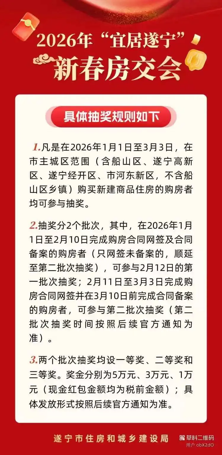 《乐山市市中区、乐山高新区2026年一季度购房奖补政策实施细则》明确,2026年1月1日至2026年3月31日,购房并完成《商品房买卖合同》网签备案可享受奖补政策: