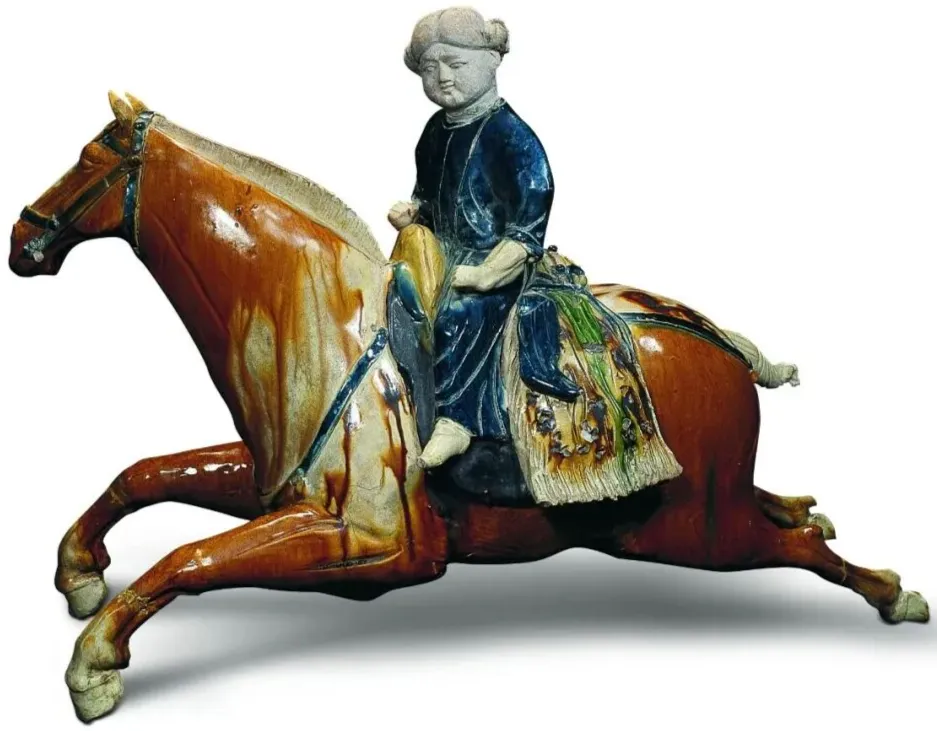 通高38厘米,1966年出土于西安莲湖区西郊制药厂唐墓,是唐三彩中罕见的腾空造型精品。胯下宝马体型彪悍、四蹄舒展腾空跃起,尽显爆发力;马背上的西域少年高鼻深目、笑容自信,头发中分梳于耳后,发髻盘结,身着蓝色长袍、脚蹬尖头靴,双拳紧握缰绳于腰间,身体微倾牢牢控马,人马合一的姿态张力拉满!现藏于西安博物馆。