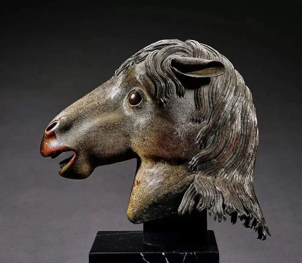 马首铜像,以分铸法、失蜡法和铆接工艺等多种技法制作而成,神态栩栩如生,毛发分毫毕现,展现出极高的工艺水准。其材质为精炼红铜,色彩深沉厚重,历经数百年风雨而不锈蚀。