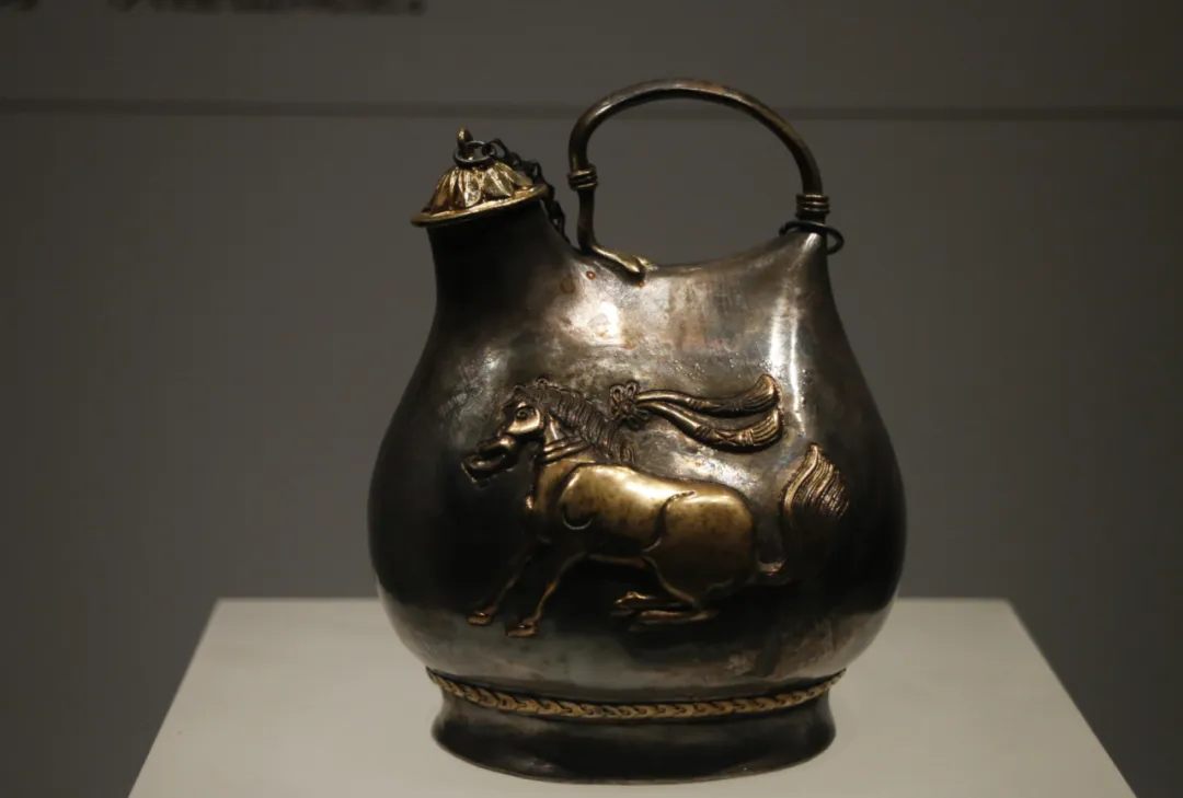 鎏金舞马衔杯纹银壶现藏于陕西历史博物馆,通高14.8厘米,重549克。其造型采用北方游牧民族常用的皮囊壶形状。壶身为扁圆形,上方一端开有竖筒状的小壶口,上置覆莲瓣式壶盖,盖顶铆有一银环,环内套接一条长14厘米的银链与弓状提梁巧妙相连。这种融合了北方民族元素的造型,正是大唐海纳百川、兼容并蓄的生动体现。