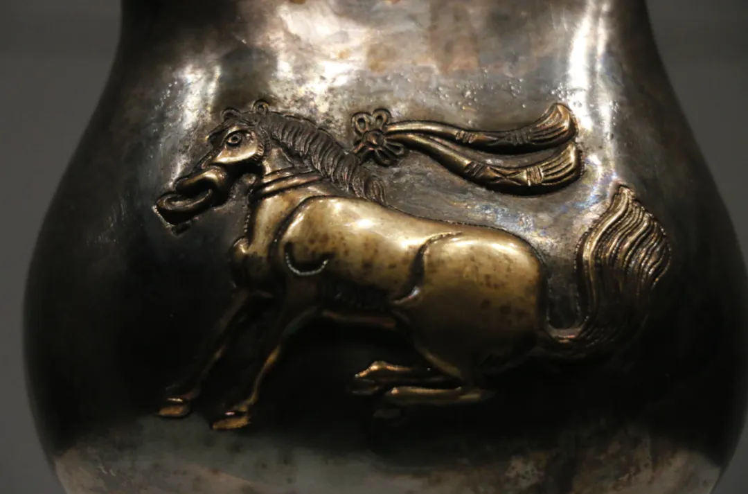 壶身最为精彩之处,在于壶腹两面以模压技法凸出的舞马形象。舞马后腿曲坐,前肢直立,口中衔杯,正作俯首跪拜状。马颈彩带飞扬,肌肉线条流畅,姿态恭谨而生动。这一瞬间,被永远定格在了银壶之上——它描绘的正是唐玄宗“千秋节”寿宴上最激动人心的一幕:训练有素的舞马随着《倾杯乐》的节奏翩然起舞,曲终时衔杯跪伏,为天子献上寿酒。