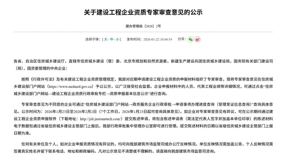 不同于以往“宽严并济”的审查模式,此次住建部资质审查彻底打破“重背景、轻数据”的惯性,依托全国建筑市场监管公共服务平台(四库一平台),实现全流程数字化、穿透式核查,最终审查结果呈现“极低通过率、零容忍造假”的鲜明特点。据住建部公示数据及行业汇总,本次审查各品类资质通过率如下,每一组数字都彰显着“最严监管”的决心:建筑业企业资质:109家企业申报,仅7家通过,通过率不足7%;工程设计资质:48家企业申报,15家通过,通过率约31.25%;工程勘察资质:5家企业申报,仅1家通过,通过率低至20%;工程监理企业资质:24家企业申报,10家通过,通过率约41.67%。更值得关注的是,此次审查无差别对待各类企业——中建五局土木工程公司、中建三局华南公司等央企下属单位,申报的建筑工程施工总承包特级资质未通过;中国中建设计研究院的工程监理、设计甲级资质升级申请也被驳回,彻底打破了“大企业必过”的固有认知。相反有一家名不经传的“苏州第五建筑集团有限公司”今年却收获了建筑施工总承包特级资质,设计建筑行业(建筑工程)甲级、建筑行业(人防工程)专业甲级三项资质升级。据悉,未予核准的企业,可登录住房城乡建设部政务服务门户,通过“申请事项办理进度查询(受理发证信息查询)”栏目,查询具体驳回原因。公示期为2026年1月23日至2月2日,有异议的企业可在公示期间提交陈述申请。深度拆解:驳回重灾区在哪?6大高频原因汇总