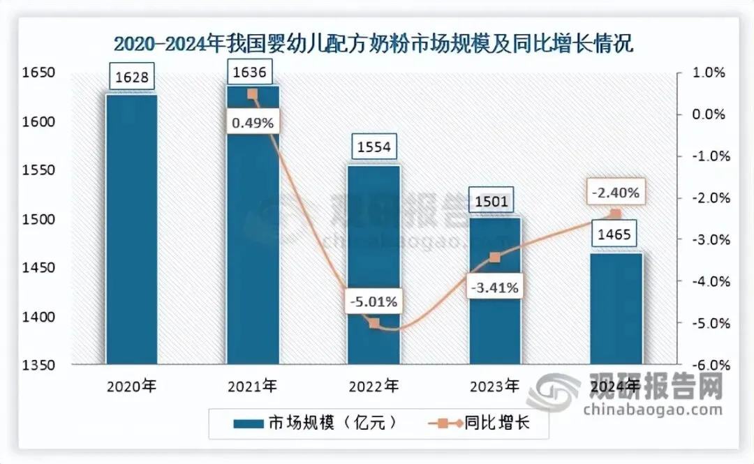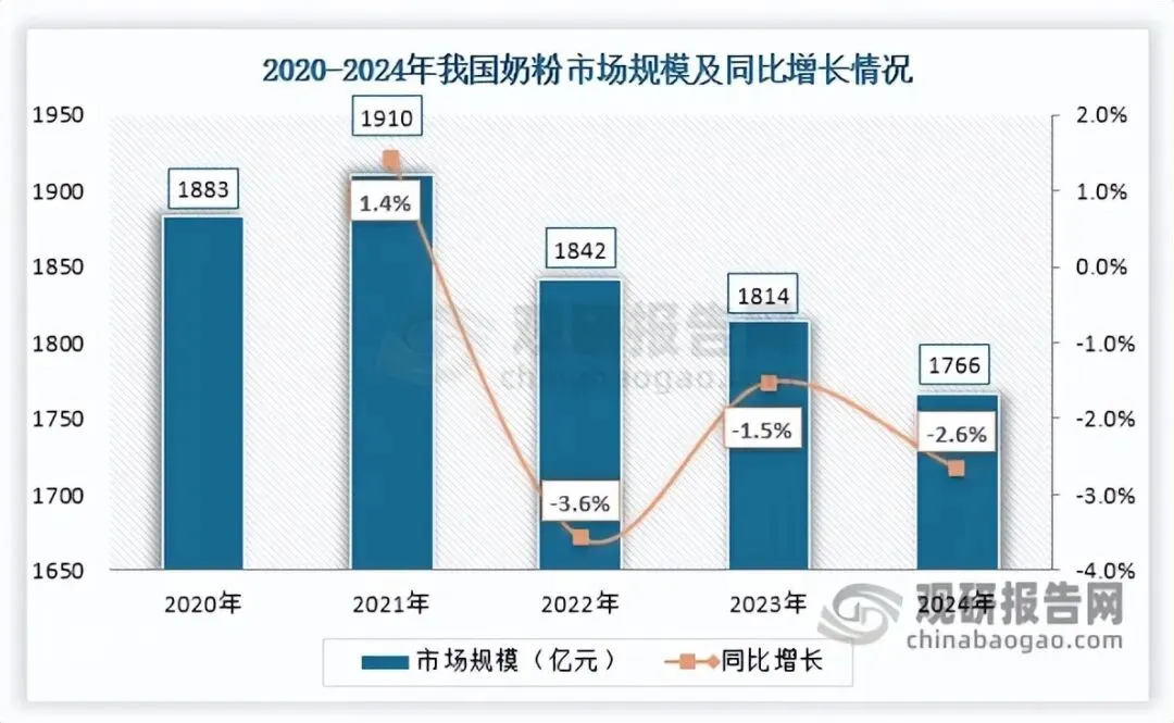 近年来,受出生人口下滑、市场竞争加剧等多重因素影响,我国奶粉市场规模呈收缩态势,由2020年的1883亿元下滑至2024年的1766亿元。婴幼儿配方奶粉作为奶粉市场第一大品类,专为0至36个月婴幼儿设计,产量与需求量均处于高位,长期在市场中占据主导地位。