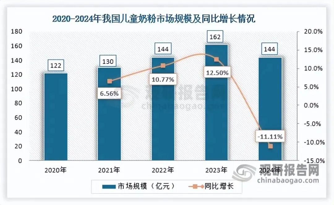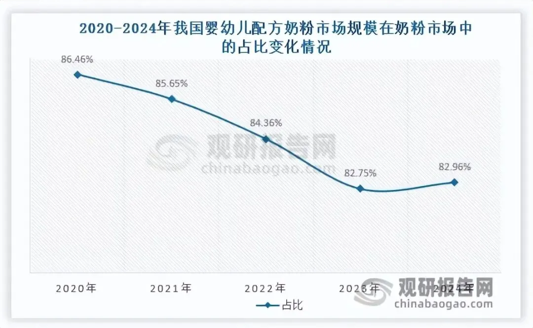 2020-2024年期间,我国婴幼儿配方奶粉市场规模从1628亿元整体下滑至1465亿元,但在2023年后,其降幅已呈现收窄态势。其市场规模在奶粉市场中的占比从2020年的86.46%下滑至2023年的82.75%,2024年小幅回升至82.96%。儿童奶粉为行业第三大细分市场,2020-2023年依托产品高端化、功能化升级等多重因素推动,市场规模由122亿元增至162亿元且增速加快,2024年市场短暂调整,规模回落至144亿元,同比下降11.11%,占整体奶粉市场8.15%。