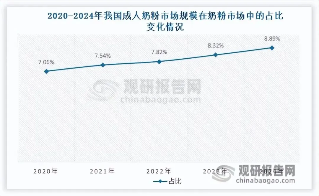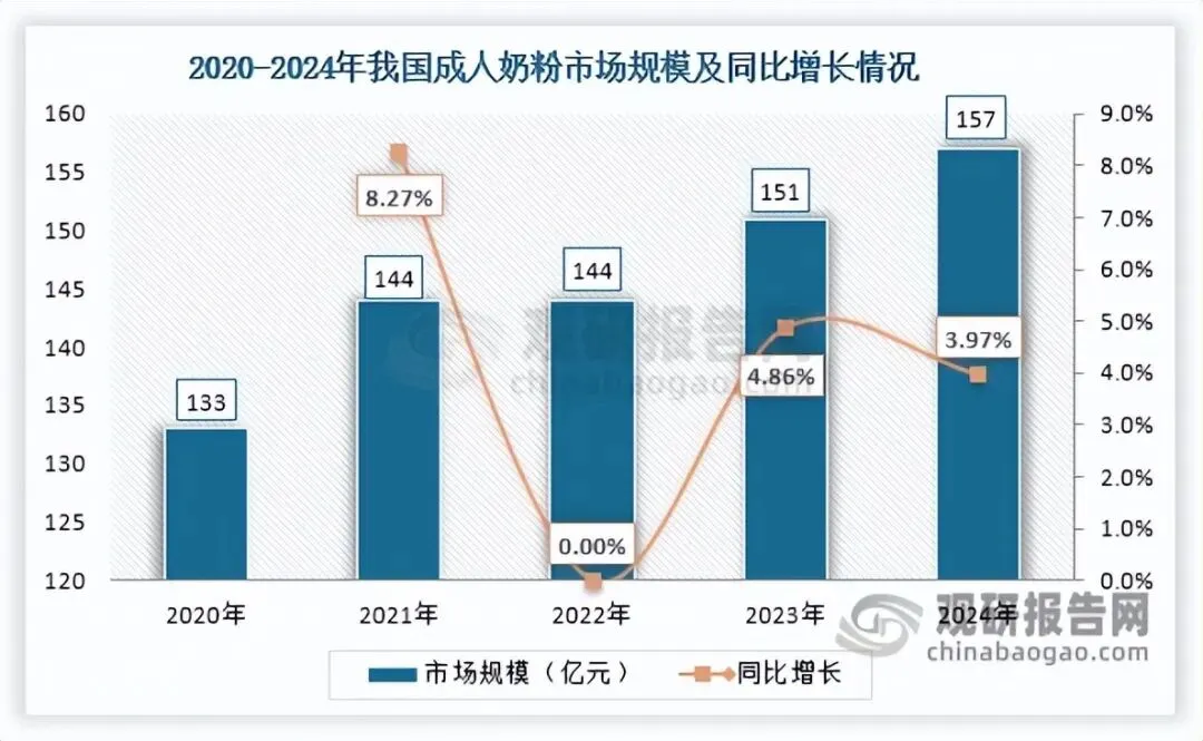 在奶粉市场整体收缩的背景下,成人奶粉细分市场表现亮眼,是2020-2024年奶粉市场中唯一规模未下滑的细分品类。数据显示,我国成人奶粉市场规模由133亿元增长至157亿元,年均复合增长率约4.23%,市场占比也从7.06%提升至8.89%,位居奶粉行业第二大细分市场。这一良好增长态势,主要得益于成人奶粉市场接受度持续提高,以及企业产品创新升级等多重因素推动。