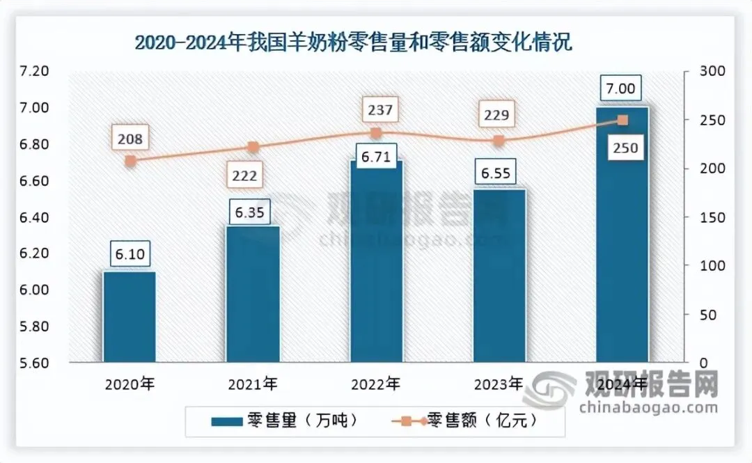 相较于牛奶粉,羊奶粉中易引发敏感人群致敏的αs1-酪蛋白含量更低,精准契合蛋白质过敏、乳糖不耐受或消化敏感人群的食用需求。凭借易于吸收、低乳糖不耐受风险以及天然高钙等优点,羊奶粉市场认可度与渗透率逐步提升。在此背景下,我国羊奶粉市场实现零售量额双增,2020-2024年零售量从6.1万吨增长至7万吨,零售额由208亿元上升至250亿元。