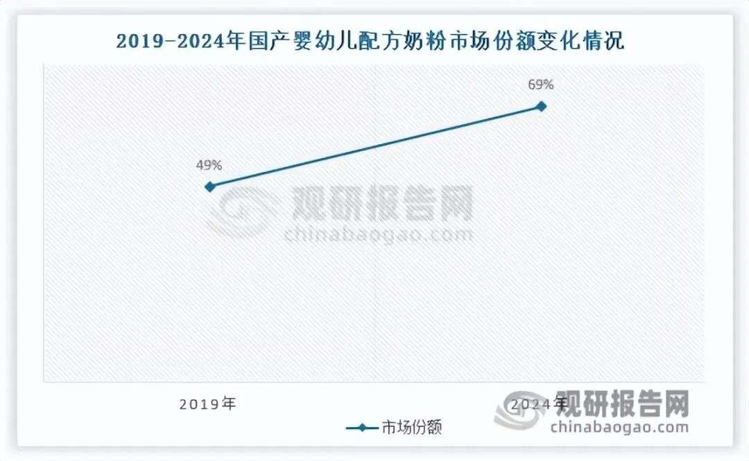 近年来,国产奶粉头部品牌依托一体化产业链核心优势,掌控上游优质牧场资源、深耕科学营养研发体系,在产品新鲜度、营养均匀性、配方严谨性等维度构建差异化竞争壁垒,产品品质实现持续升级。凭借上述综合优势,国产奶粉品牌的市场竞争力与行业话语权不断提升,其中国产婴幼儿配方奶粉品牌的市场份额从2019年的49%上升至2024年的69%。