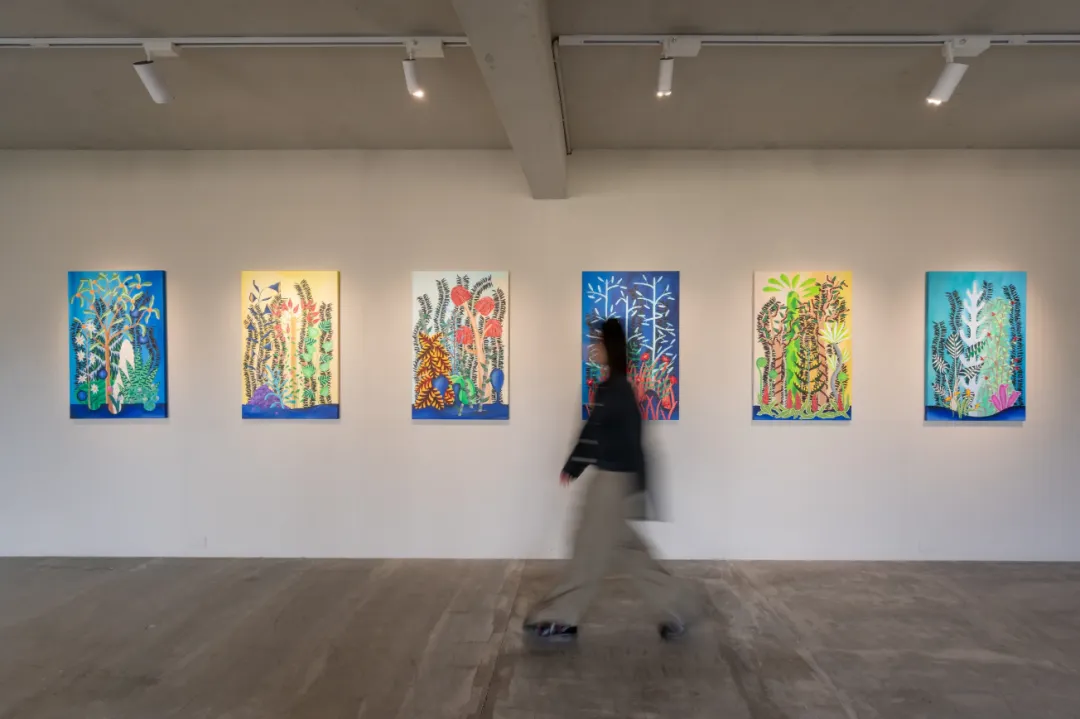 展览由一系列压克力画作构成,皆采用相同的直幅尺寸(100 × 65 公分)。艺术家透过固定画幅与电影感的水平悬挂方式,刻意仿真当代视觉文化中的标准化、重复性与数字消费模式。画布在此不再只是承载图像的平面,而是一种接口——一个模块、一段视觉节奏,让人联想到滑动屏幕时,风景被快速吸收又立即被下一张影像取代的机械式节奏。