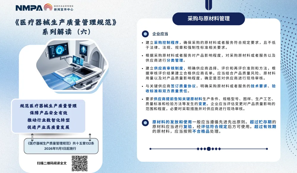 以上图片来源于国家药监局的系列解读六,聚焦于新版《医疗器械生产质量管理规范》中采购和原材料管理,核心目标是从源头控制产品质量风险,确保所用原材料安全、合规、可追溯。