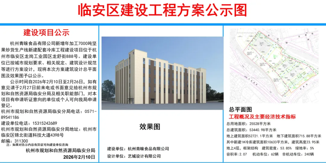 项目位于杭州市临安区龙岗工业园区龙舒街888号。总用地面积25528平方米,总建筑面积约53440平方米,其中地上建筑面积52721平方米,地下建筑面积715.88平方米,新建1#冷库建筑面积10633平方米,建筑高度约24米,地上4层。