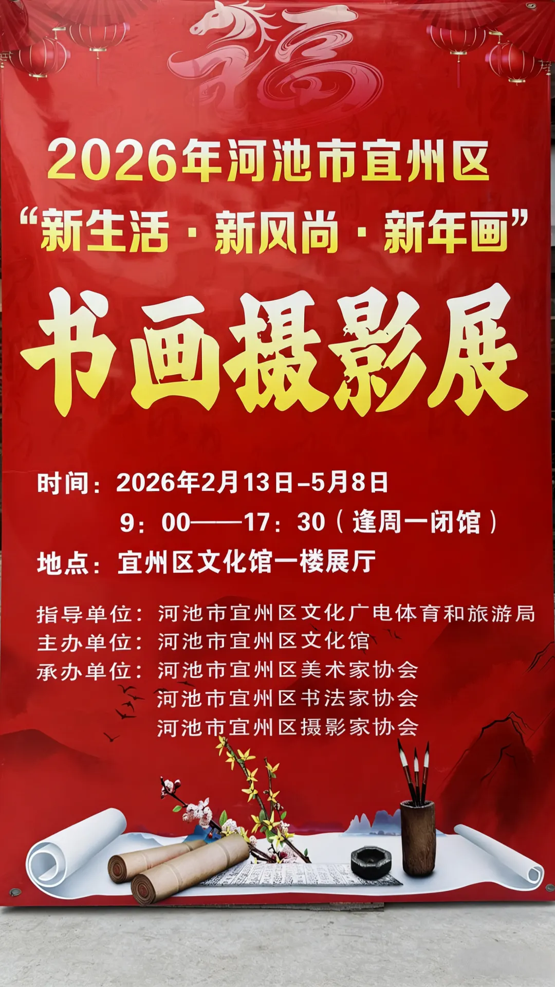 本次“翰墨光影贺新春”展览面向广大市民群众免费开放,以笔墨丹青与光影镜头共迎新春佳节。活动共征集我区本土文艺作者作品近200件,涵盖书画、摄影多个门类。经专业评委严谨评审、优中选优,最终遴选出入展作品100余件,其中书画作品73件、摄影作品30件。作品题材丰富、风格多样,尽显宜州本土文化底蕴与文艺创作者的时代风采,为市民献上一场新春文艺盛宴。
