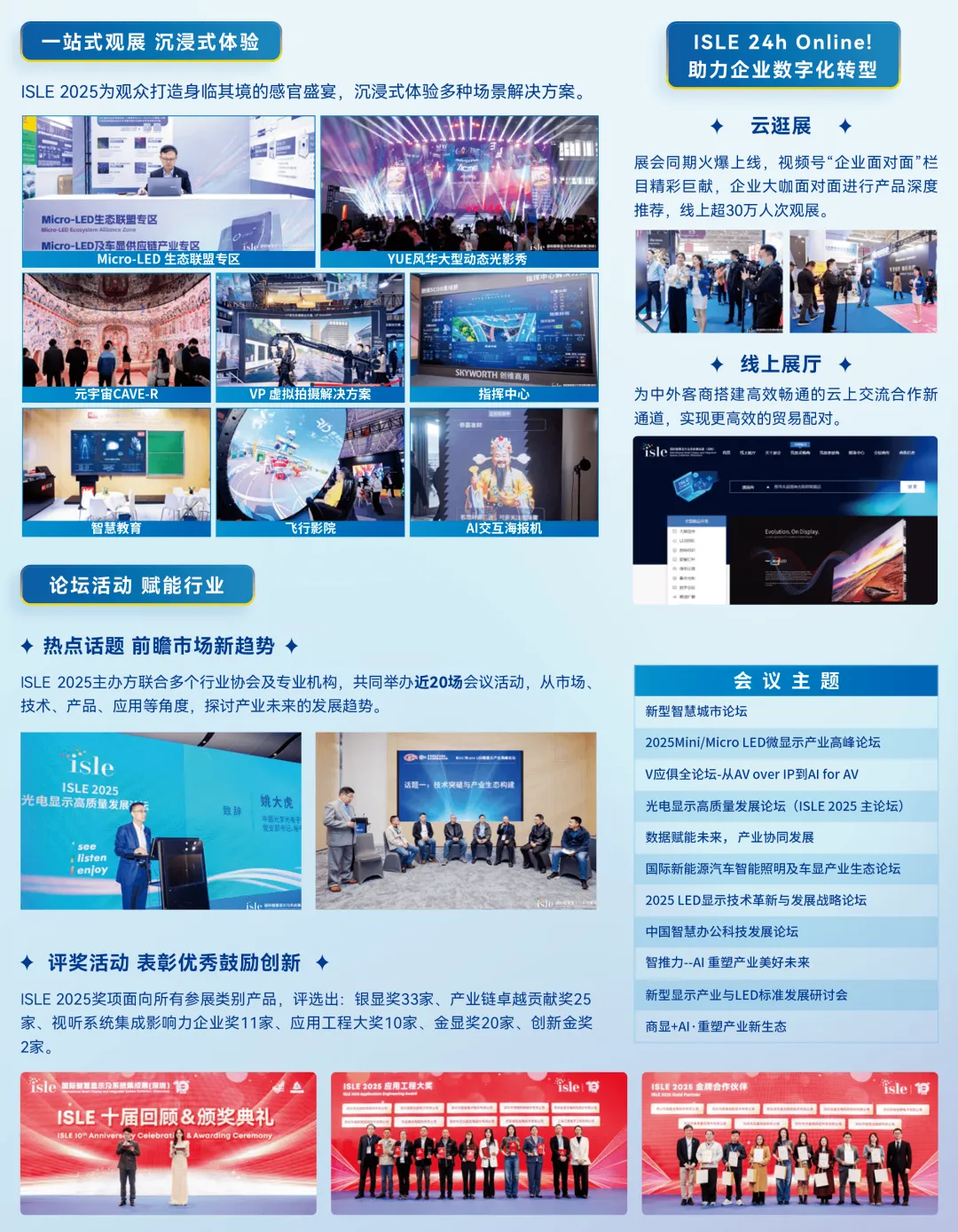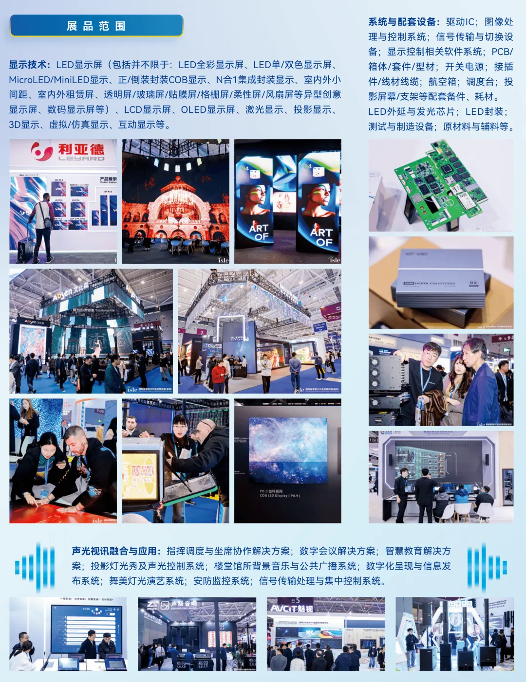 2026 ISLE将以前所未有的超大规模闪亮登场,充分展示显示技术及配套设备、LED全产业链产品、音视频集成、声光视讯融合与应用以及AI+应用等专业领域最新技术和应用端创新成果,ISLE2026规划大屏显示技术及配套专区、舞台灯光音响体验专区等多场景沉浸式体验区,还将打造AI+智慧显示与系统集成应用专区、可穿戴技术及新型消费电子两大全新体验区,打造"订单+展演+体验+研讨学习"的全新模式,全力以崭新姿态引领全球行业新风向。