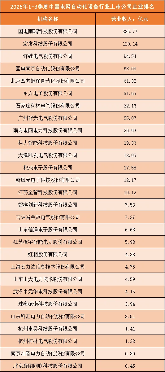 一、2025年1-3季度中国电网自动化设备行业上市公司企业排名分析