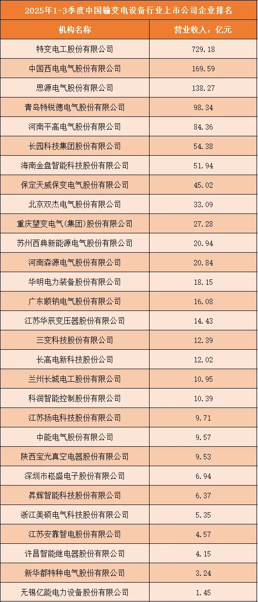 一、2025年1-3季度中国输变电设备行业上市公司企业排名分析