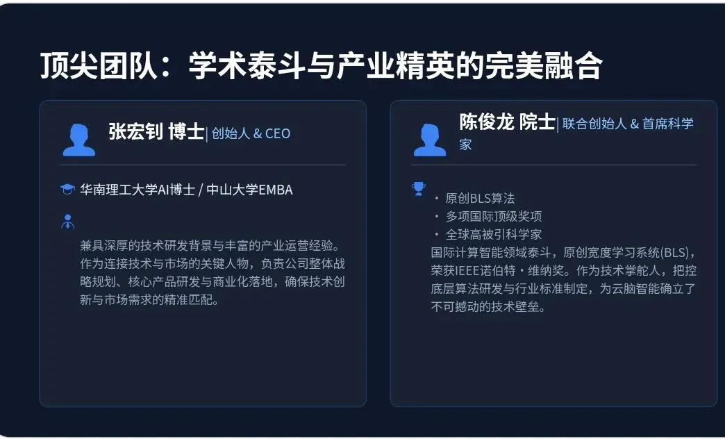 顶尖团队为企业发展保驾护航。创始人张宏钊博士深耕AI与产业运营,打通技术研发、临床落地与商业化全链路;陈俊龙院士作为技术掌舵人,把控底层算法、科研转化与行业标准制定,拉高企业技术天花板。团队融合脑科学、AI算法、医疗器械、临床康复等多领域精英,兼具前沿创新与落地能力,形成“学术+产业”双轮驱动格局。