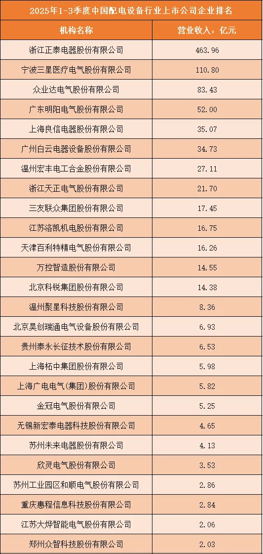 根据申万行业分类,2025年1-3季度中国配电设备行业上市公司按营业收入排名如下:(A股上市公司)
