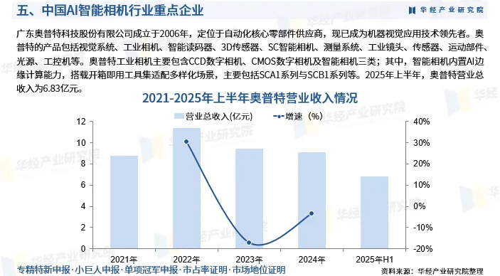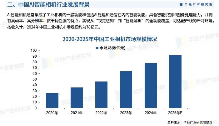 AI智能相机通常集成了工业相机的一般功能和包括AI处理和通信在内的智能功能,具备智能识别和图像处理能力,并拥有高帧率、高分辨率、抗干扰性强的特点,实现从“视觉感知”到“智能解析”的全功能覆盖,可适配产线的严苛环境。按收入计,2024年中国工业相机市场规模约为78亿元。
