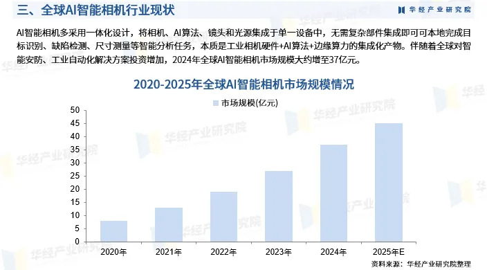 AI智能相机多采用一体化设计,将相机、AI算法、镜头和光源集成于单一设备中,无需复杂部件集成即可可本地完成目标识别、缺陷检测、尺寸测量等智能分析任务,本质是工业相机硬件+AI算法+边缘算力的集成化产物。伴随着全球对智能安防、工业自动化解决方案投资增加,2024年全球AI智能相机市场规模大约增至37亿元。
