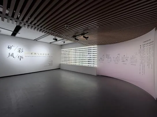 该展览是我馆馆际交流、社会合作与公众参与深度融合的一次成功实践。30组馆藏精美矿物标本首次展出;来自“丹青妙相”矿彩工作室的7个视频还原了古法矿物颜料制作过程;与中国矿业大学中国煤炭科技博物馆首次合作,将《古代矿物颜料制作工艺流程图》原创绘画作品展出;600余瓶出自图腾画材匠人之手的矿物颜料呈现智慧;50位艺术家的77件/组岩彩作品。他们共同在展厅里构建了一个时空交错的场域,让远古的矿脉与当代的灵思静静共鸣。