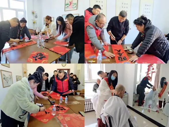 活动现场,慰问组为福利院送去糕点、大米、水果、香肠、饮料等价值 5000 余元的慰问物资,与老人们亲切交流,细致询问生活起居与身体状况,倾听心声、传递温情,送上真挚的新春祝福,切实把党和政府及工会组织的温暖与关爱送到特殊群体身边。活动还特邀我市知名书法家现场挥毫泼墨,精心创作春联与 100 个 “福” 字,将浓浓年味与美好祝愿化作笔墨丹青,为大家送百福、祝安康。同时,组织美发行业会员为老人和儿童义务理发,让大家以清爽整洁的面貌喜迎新春佳节。
