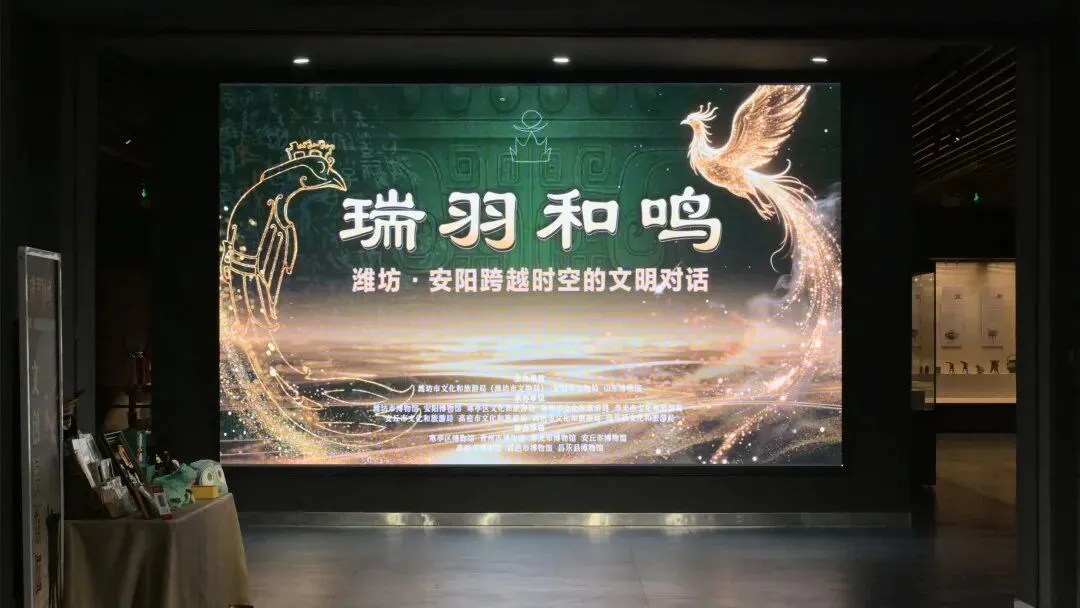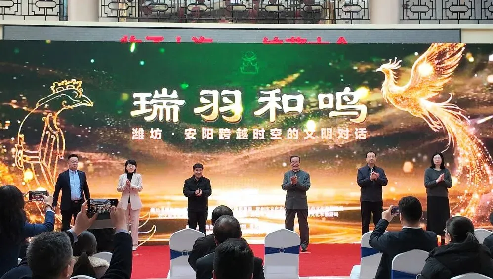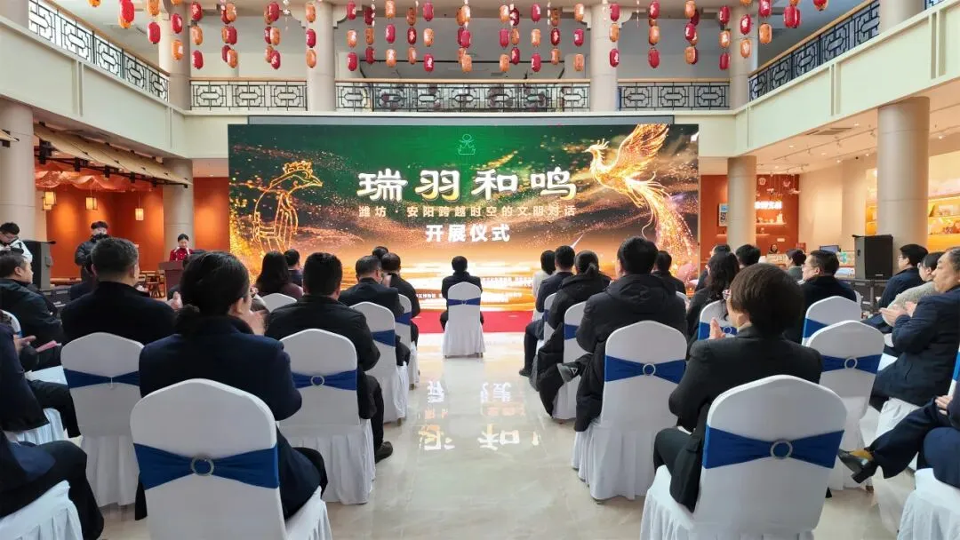 2026年2月12日上午,“瑞羽和鸣——潍坊·安阳跨越时空的文明对话”展览开展仪式在潍坊市博物馆主展馆隆重举行。本次活动由潍坊市文化和旅游局、安阳市文物局、山东博物馆联合主办,潍坊市博物馆、安阳博物馆、寒亭区文化和旅游局、青州市文化和旅游局、寿光市文化和旅游局、安丘市文化和旅游局、高密市文化和旅游局、昌邑市文化和旅游局、昌乐县文化和旅游局承办,寒亭区博物馆、青州市博物馆、寿光市博物馆、安丘市博物馆、高密市博物馆、昌邑市博物馆、昌乐县博物馆协办。山东省文化和旅游厅博物馆与社会文物处二级调研员董桂林,潍坊市文化和旅游局党组书记、局长高强,安阳市文物局副局长魏爱霖,山东博物馆副馆长王勇军,中国先秦史学会周公思想文化研究会副理事长、山东博物馆特聘首席专家、山东大学·山东师范大学·烟台大学兼职教授、潍坊市博物馆特聘研究员孙敬明,安阳博物馆副馆长刘晓阳,潍坊市文化和旅游局党组成员、四级调研员李义龙,潍坊市文化和旅游局四级调研员刘允泉,潍坊市博物馆党总支书记、馆长郑晓光等领导嘉宾出席;各县市区文化和旅游主管部门、有关博物馆负责同志,市博物馆中层以上干部职工、媒体记者等约60人参加活动。