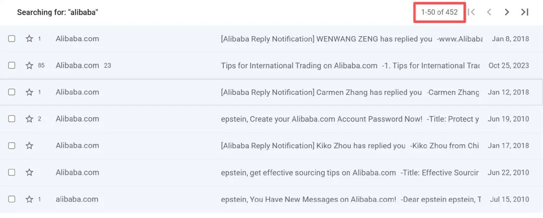 在曝光的爱泼斯坦邮件往来记录里,各类国际事务、高端资源对接的邮件占了绝大多数,而关于家具采购的内容,虽不起眼却细节满满,其中阿里国际站更是多次出镜,以“alibaba”进行搜索,相关记录达450条之多。