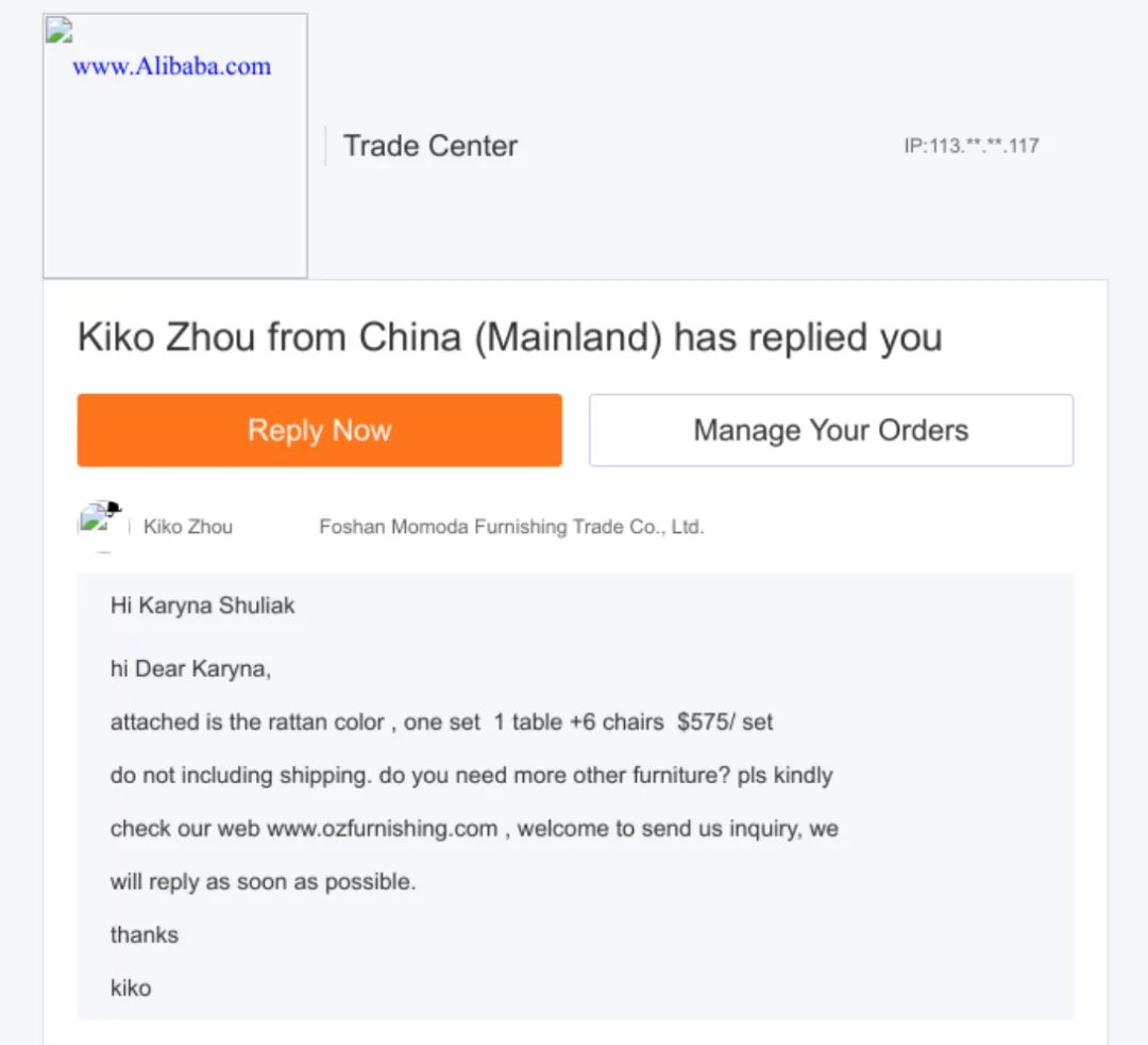 在他发给助理的一封邮件里,直接附上了阿里国际站上佛山家具厂的产品链接,语气干脆地要求对比几家的价格、定制能力,还特意强调“重点确认能不能30天内完成生产和装柜,直发迈阿密”,连目的港都标注得一清二楚。