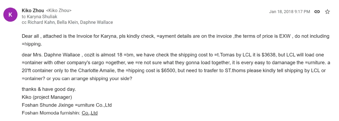 2018年1月,佛山顺德某家具有限公司向爱泼斯坦团队的相关人员发送了发票,明确标注价格条款为EXW(工厂交货价),不包含运费,还针对约18立方米的货物运输提出了专业建议。