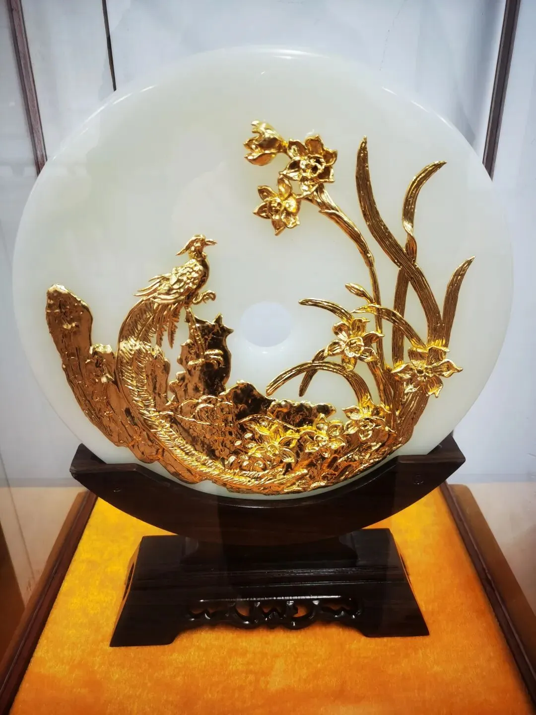 漆线雕:细密柔韧的漆线层层盘绕,堆叠出水仙花瓣的轻盈与叶片的飘逸,金彩交错间,尽显华而不俗的典雅。