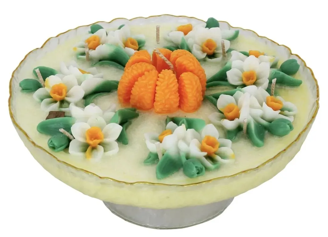 蜡烛画:以融化的彩蜡为墨,通过滴、塑、雕等技法,在烛身上凝筑出水仙的立体姿态。烛光摇曳时,剔透的蜡层与光影交织,让水仙仿佛在温暖的光晕中静静绽放,集视觉之美与氛围之雅于一体。