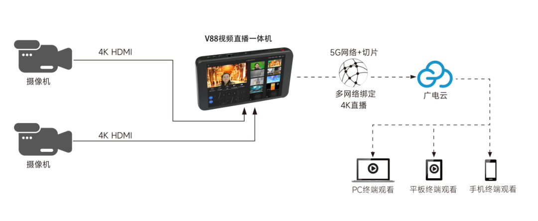 功能齐全小巧灵动颜值高!在第三届数博会上,禾鸟带来了全新一代 5G便携式直播一体机: V88,它小巧灵动,拥有丰富的视音频接口, 集成了功能强大的V导播软件,支持4K/8K高清视频直播,其最大的亮点是融合了5G网络切片技术 ,有效保障超高清视频直播流的稳定、低延时的传输,为广电级的用户带来极具性价比的专业产品。相比传统昂贵的5G背包,轻巧易操作的V88直播一体机,是融媒体时代,单兵户外直播的首选方案!
