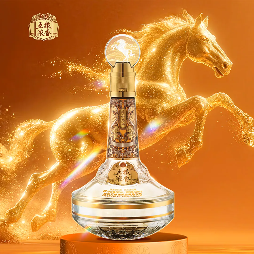 五粮浓香·丙午马年生肖酒以“金鞍载福,万象更新”为主题。产品延续经典蒜头瓶型,瓶头采用3D激光雕刻工艺,瓶身镶嵌鎏金品牌标识;骏马纹样以金花纸纯手工贴绘,精工勾勒祥瑞之姿。酒体依托五粮浓香核心工艺,定位礼赠与收藏市场,兼顾品饮价值与文化仪式感。