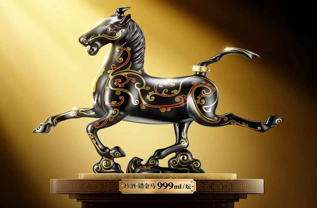 珍酒·错金马复刻东汉青铜器“铜奔马”三足腾空之姿,999ml坛体以国瓷手工成型,玄黑底色饰红金卷云纹。定价4888元/坛,全球限量2000坛,每坛附独立收藏编码。酒体由国家级评委吴长贵小批量勾调,延续“错金”系列“一器一文物”的文化IP路径。