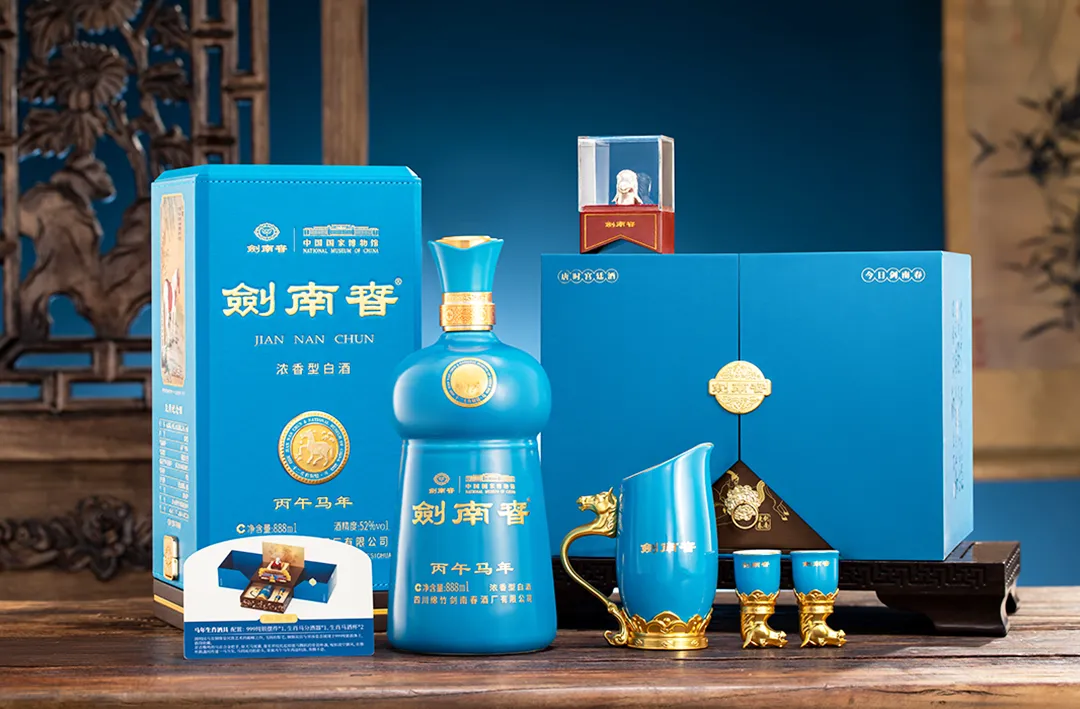 剑南春·丙午马年生肖纪念酒由中国国家博物馆联名打造,以馆藏“隋·光正随人十二生肖铜镜”为灵感源,取铭文“光正随人,长命宜新”寄寓新年。包装两侧分饰铜镜纹样与郎世宁画作午马元素,以靛蓝主调承袭唐风雅韵。全球限量3万瓶,每瓶附独立收藏编码,续写“唐时宫廷酒”之名酒坐标。