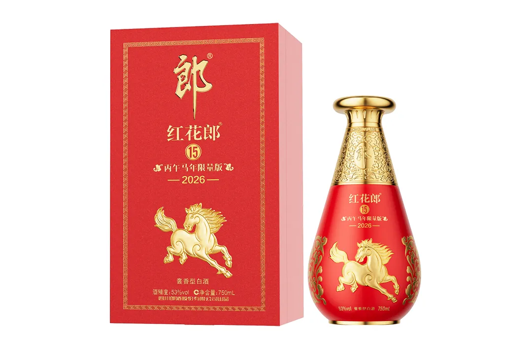 红花郎·丙午马年限量版采用水滴瓶型,瓶身鎏金骏马配炽烈红釉,750ml定价1399元,全球限量19700件(每件4瓶)。该系列以“马跃乘风”(8999元/1.5L)锚定高端收藏,青花郎(2999元/750ml)切入礼赠赛道,红花郎覆盖宴请场景,形成从顶级藏品到大众消费的全价位覆盖。