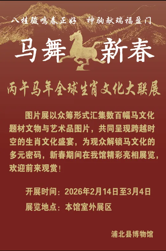 2026年春节到来之际,“马舞新春——丙午马年全球生肖文化大联展”将于2月14日在浦北县博物馆室外展区拉开帷幕,邀您共赴一场新春文化之约。