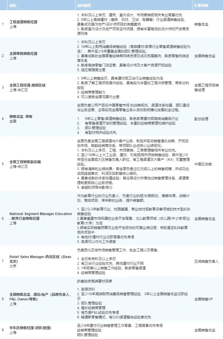 【欧美企业建材行业销售岗位合集】