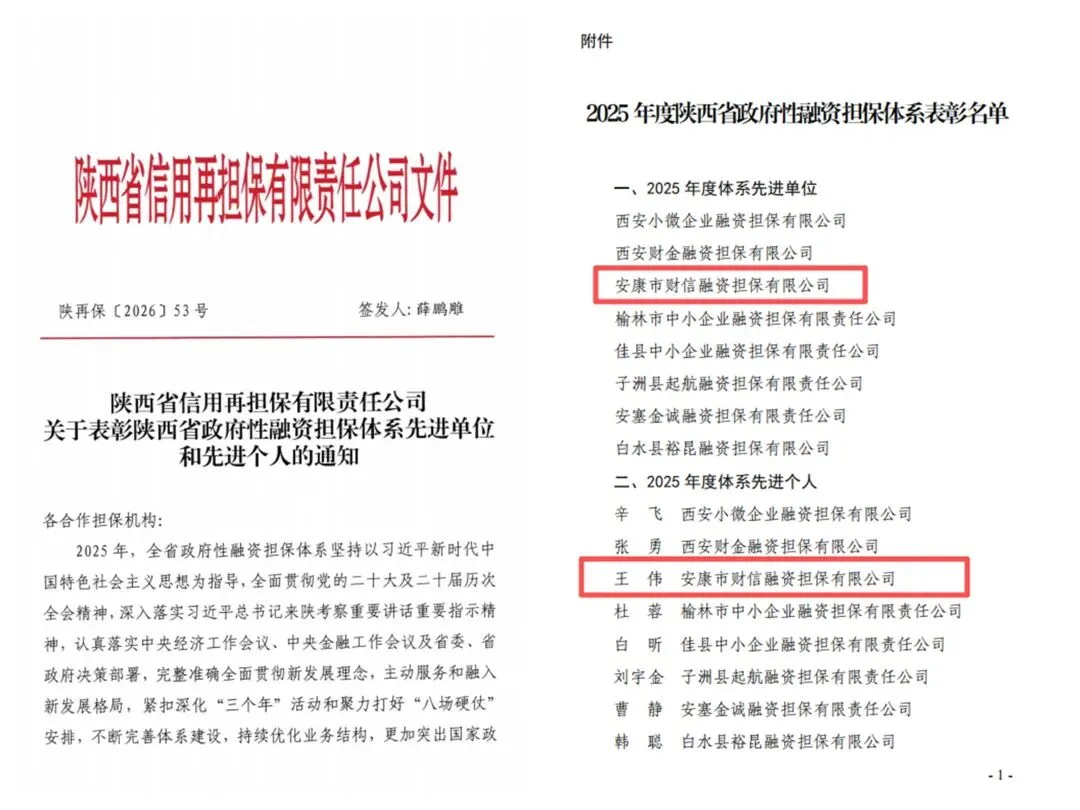 近日,陕西省信用再担保有限责任公司印发《关于表彰陕西省政府性融资担保体系先进单位和先进个人的通知》(陕再保〔2026〕53号)文件,安康市财信融资担保有限公司荣获2025年度陕西省政府性融资担保体系“先进单位”,公司风控评审部副经理王伟同志喜获体系“先进个人”荣誉表彰。