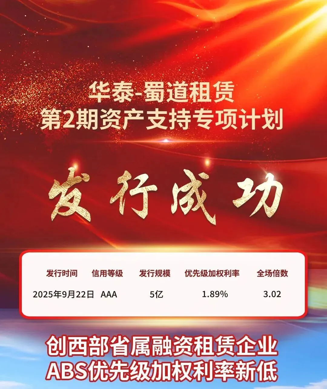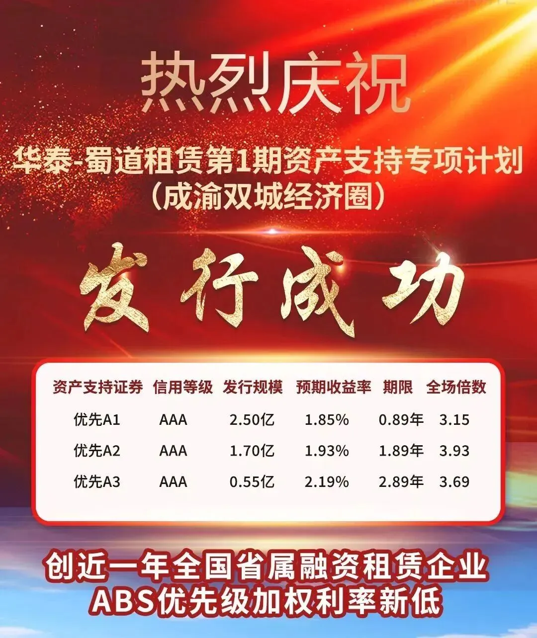 蜀道融资租赁公司首单资产支持证券(成渝双城经济圈)成功发行,储架10亿元,首单发行规模5亿元,优先A1级票面利率低至1.85%,簿记全场认购倍数超3.49倍,创近一年全国省属融资租赁企业ABS优先级加权利率新低,以产融协同助力区域经济高质量发展。