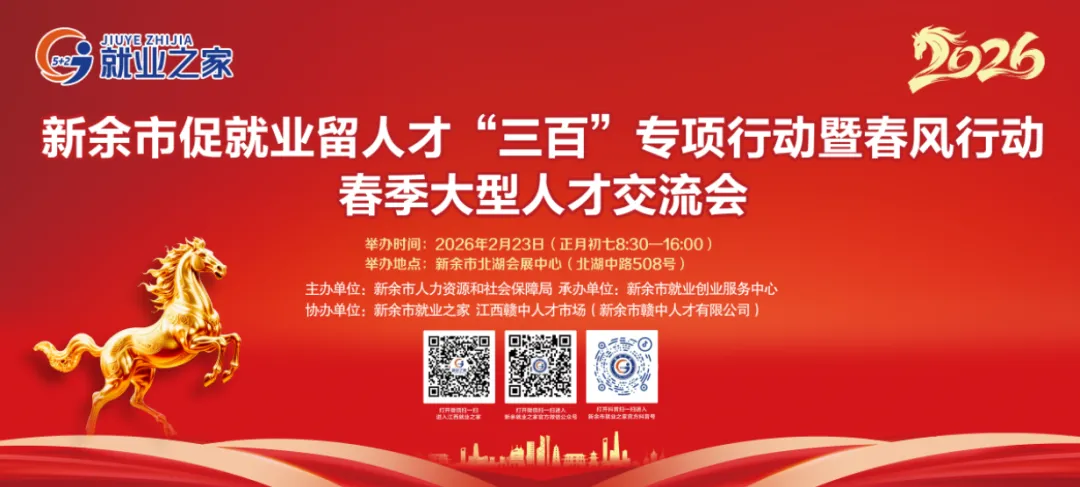 为深入实施“六大行动计划”,全面打造新型工业强市,构建人才强市战略,同时进一步加强2026年春节期间公共就业服务,推动返乡农民工、脱贫劳动力等我市各类就业群体实现高质量就业,满足我市企业春季用工需求,新余市人力资源和社会保障局决定举办主题为新余市促就业留人才“三百”专项行动暨春风行动春季大型人才交流会。