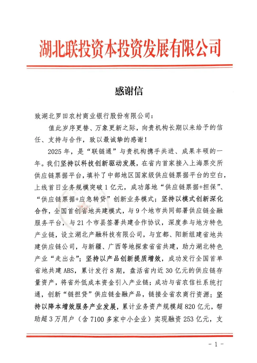 2月13日,罗田农商行收到湖北联投资本发展有限公司(以下简称省联投)发来的感谢信。信中对湖北省农信联社与省联投通力合作,以罗田农商行为试点,成功实现业务系统对接、创新推出“链担通”供应链金融产品给予充分肯定。截至目前,省联投通过该产品,累计帮助超过3万家企业实现融资253亿元,其中普惠融资149亿元,融资100%为无不动产抵押,综合降低企业成本6.46亿元,金融服务实体经济效能显著提升。