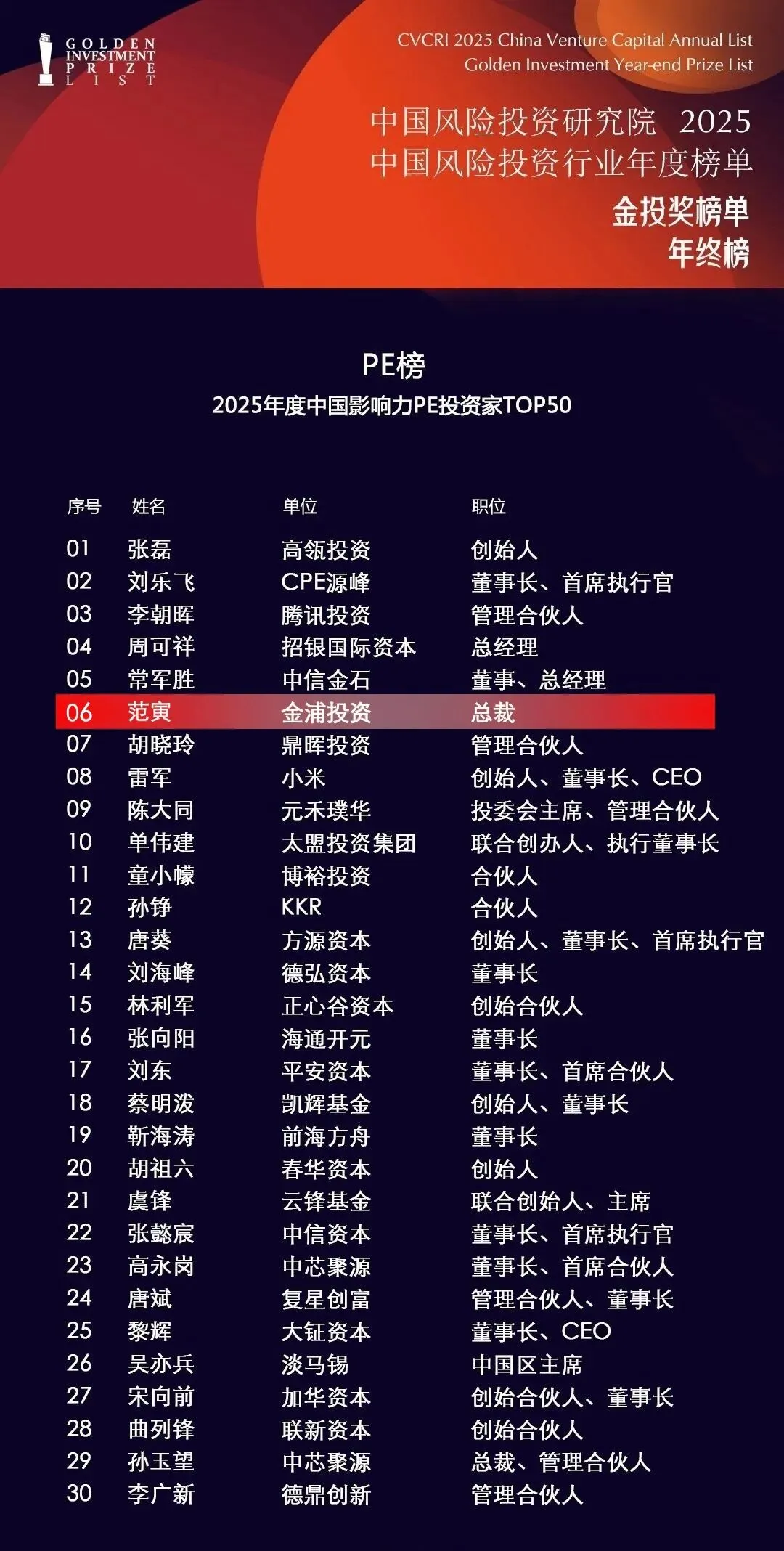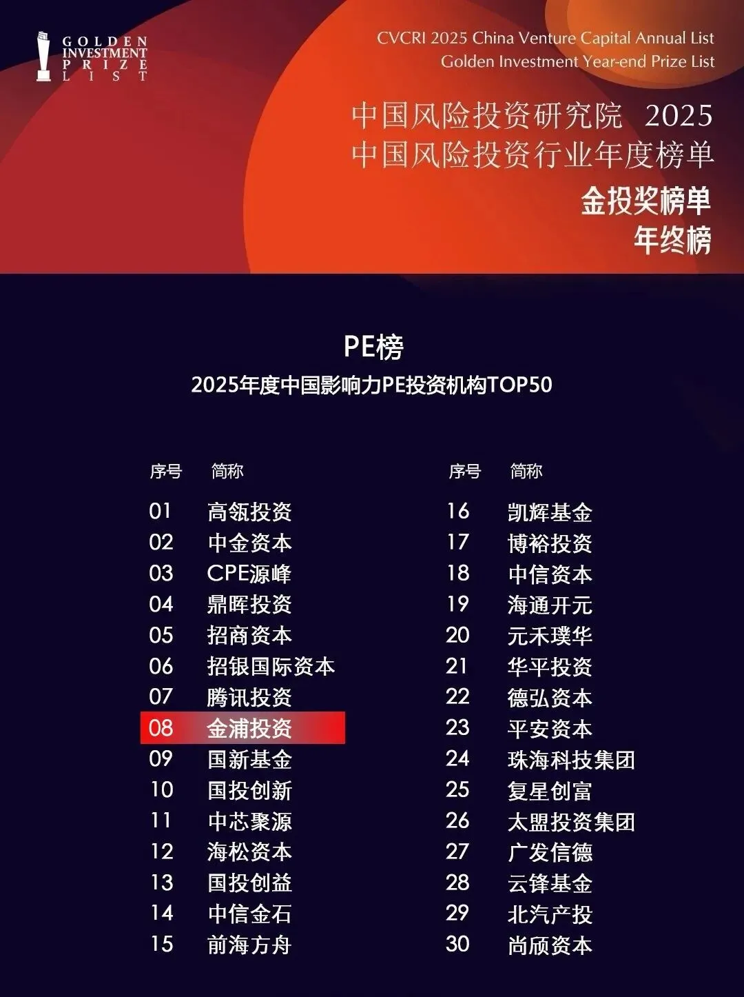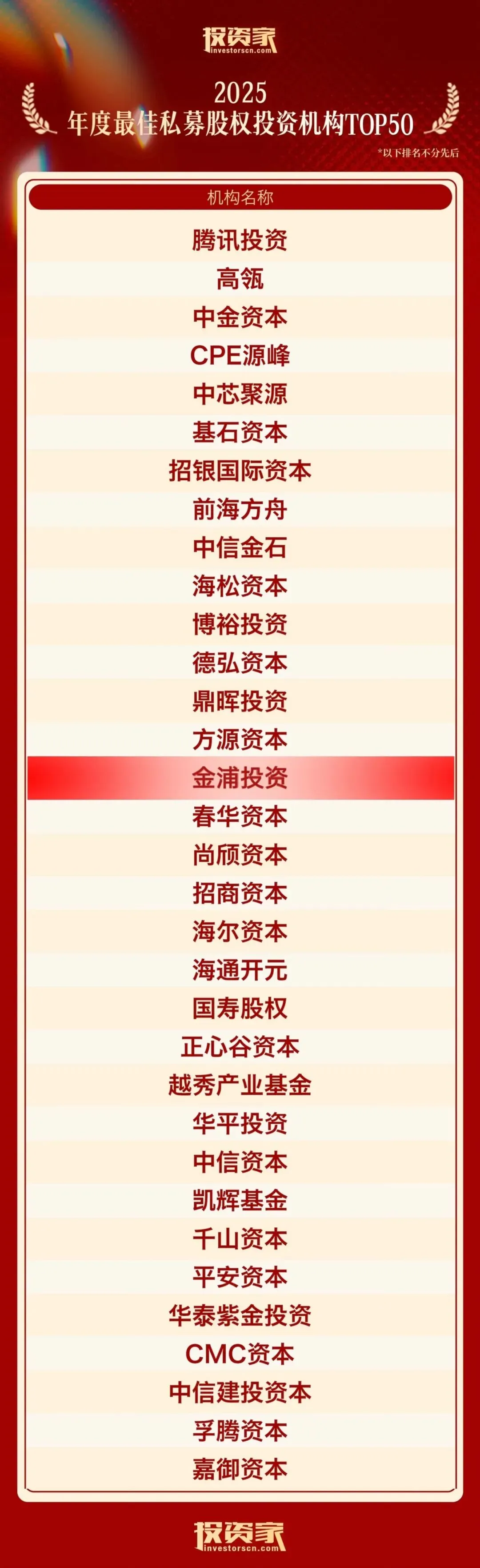 1月29日,投资家网正式揭晓「2025股权投资年度榜单」,金浦投资荣获“2025年度最佳私募股权投资机构TOP50”,同时,总裁范寅荣获“2025年度最佳私募股权投资人TOP30”等奖项。