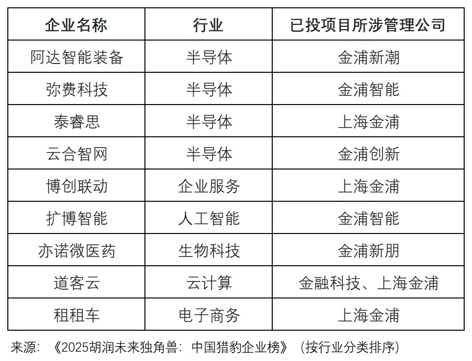 1月26日,胡润百富发布「2025胡润未来独角兽:中国猎豹企业榜」,榜单列出了中国成立于2000年之后,五年内(即到2030年底)最有可能达到独角兽级十亿美金估值的高成长性企业。本次榜单估值计算的截止日期为2025年10月31日。胡润研究院在中国找到304家猎豹企业,生物科技、健康科技、企业服务、半导体及人工智能五大领域的企业合计占比超六成。其中,金浦投资及旗下子公司投资的13家企业登榜。