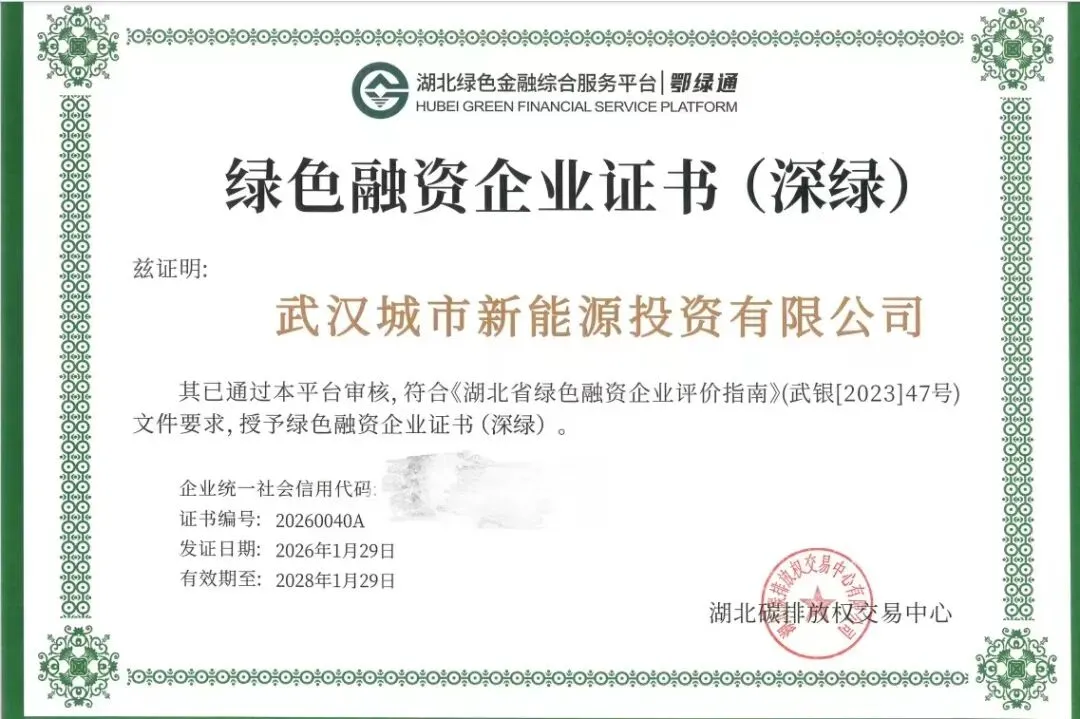 近日,市能源集团公司所属新能投公司成功通过绿色融资企业“深绿”认证,该认证由湖北碳排放权交易中心有限公司颁发,主要评估企业在绿色经营生产、环境管理、资源利用等方面的综合表现,标志着企业在绿色转型、节能减排与可持续发展方面取得的成就获得权威认可。