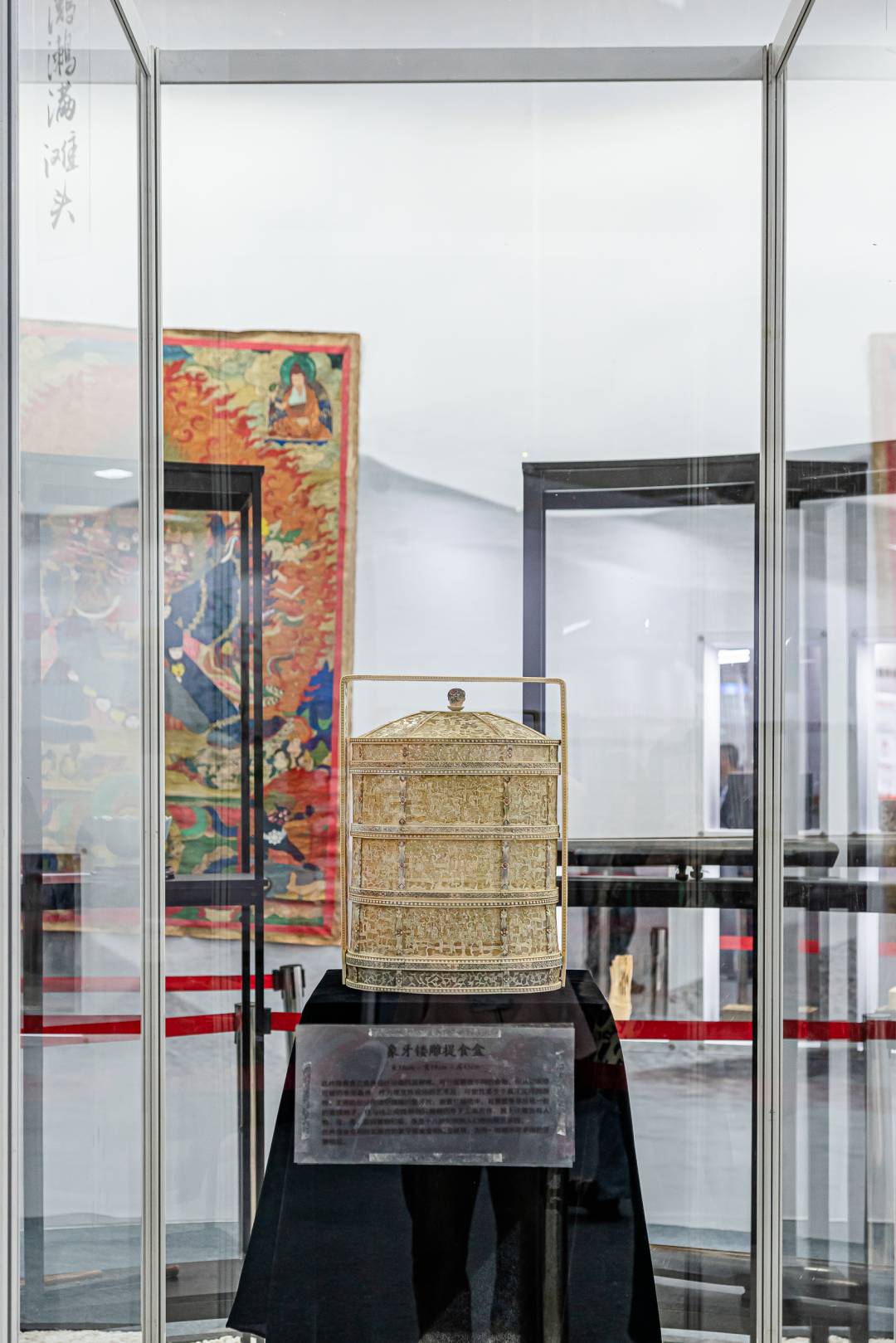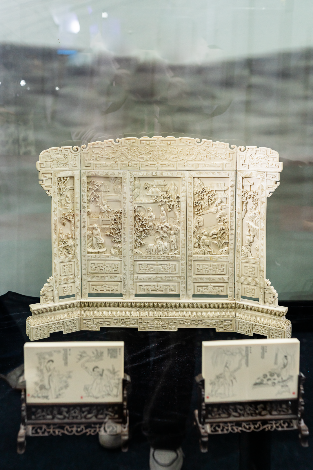镂空精雕技艺巧夺天工的「象牙镂雕提食盒」;构图生动、别具匠心的「象牙人物屏风」;闻名遐迩的“龙骑兵瓶”之一「青花釉里红牡丹披肩纹瓶」;20世纪初伟大的政治家唐绍仪旧藏「青花釉里红缠枝西蕃莲玉壶春瓶」;清代郎世宁创作的「圆明园铜版画」;张之洞、贺良朴、孙中山等名家的字画纷纷现身展览精品区。