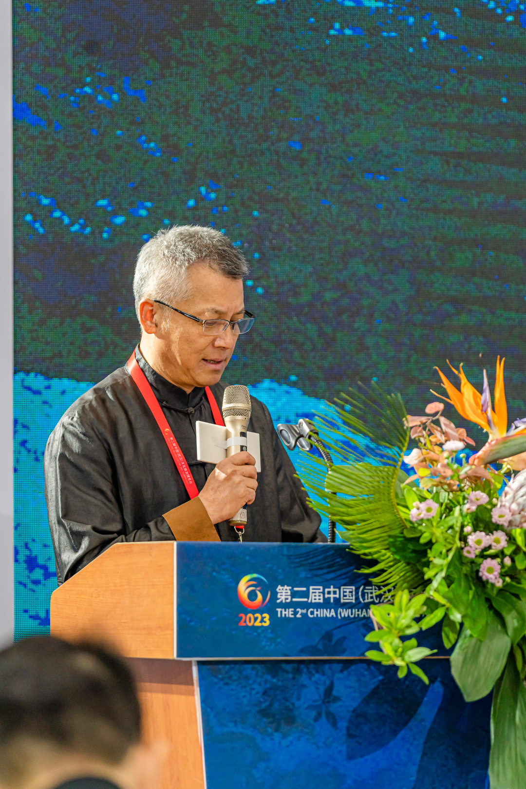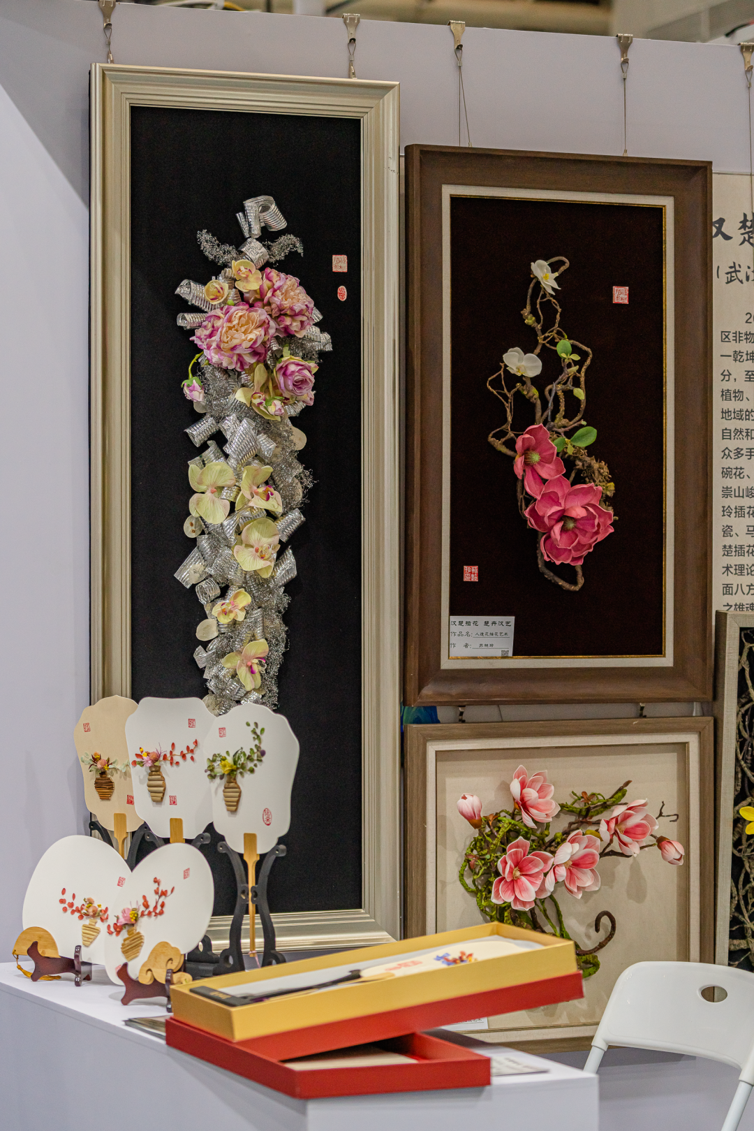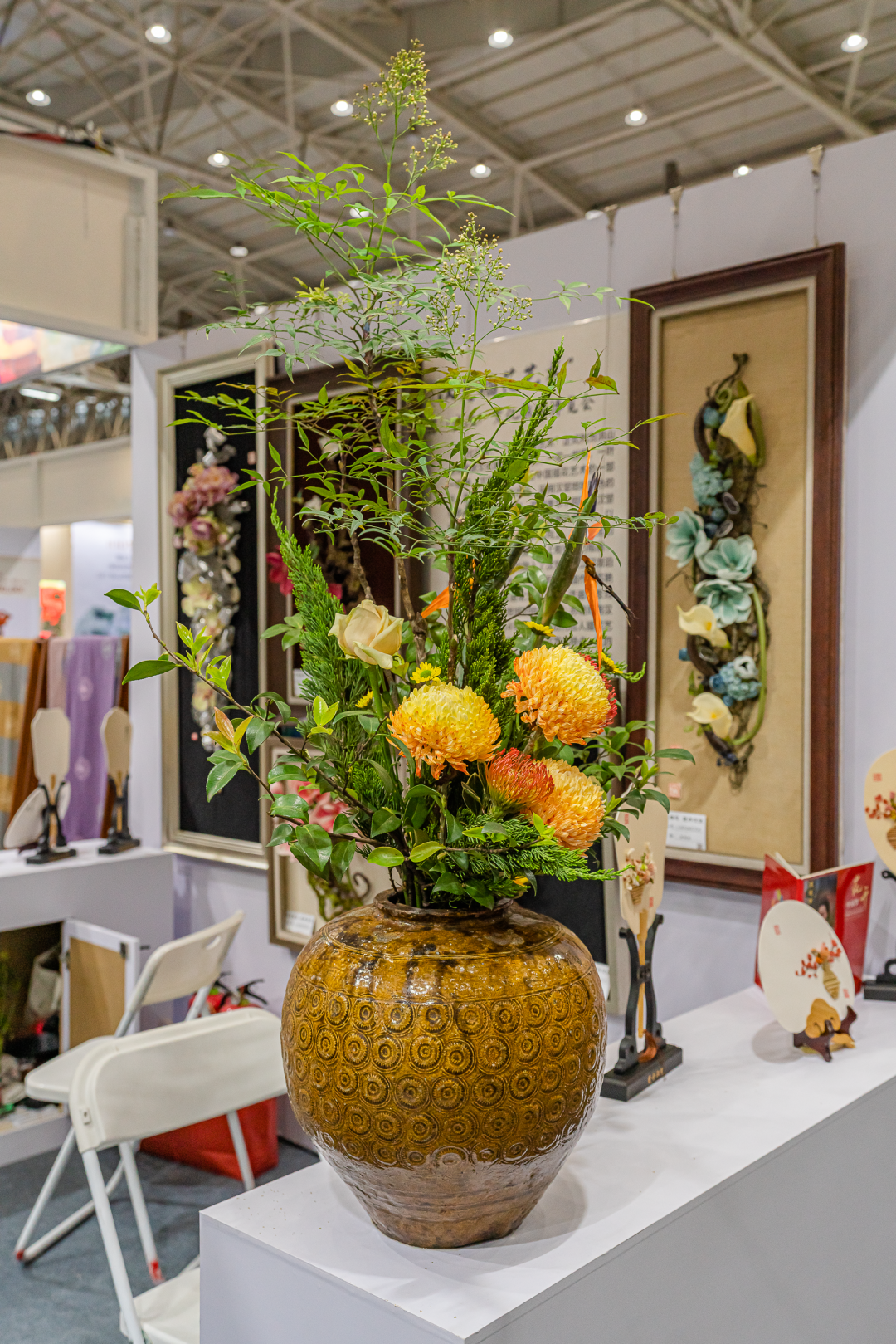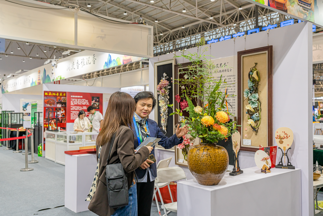 花艺名家苏艳玲老师在「汉楚插花艺术区」为观众们悉心宣传洪山区非遗保护项目汉楚传统插花艺术。作品在花材花卉的运用上融入了汉楚地域特有的花卉和植物素材,枯荣相生,代表了富贵吉祥。