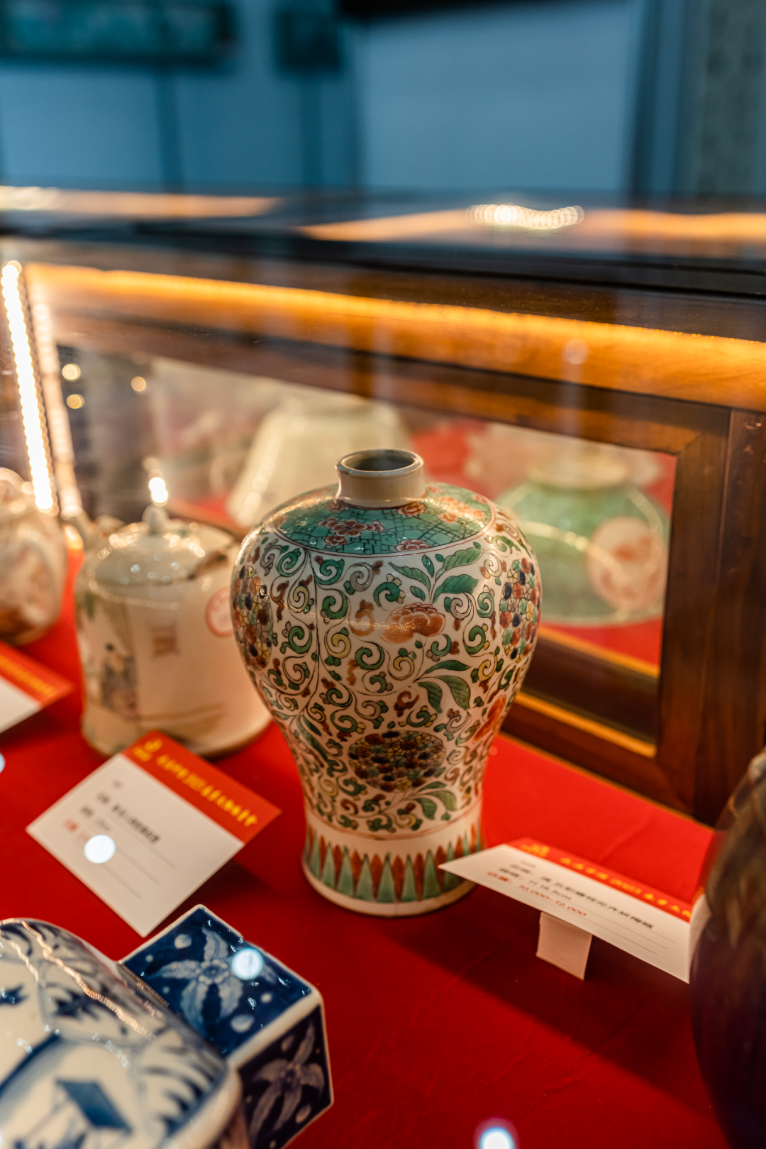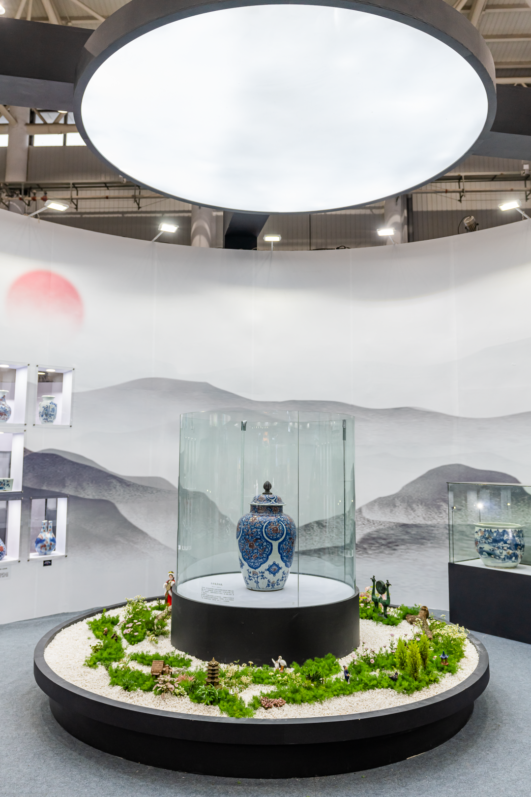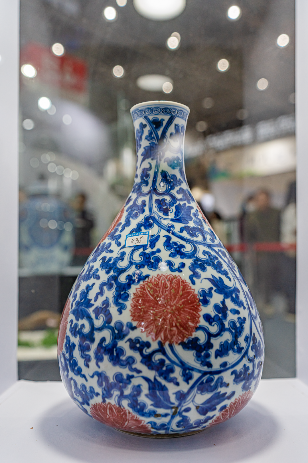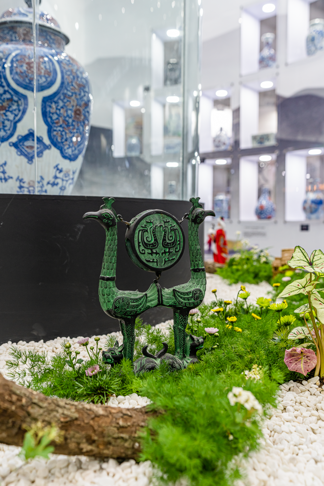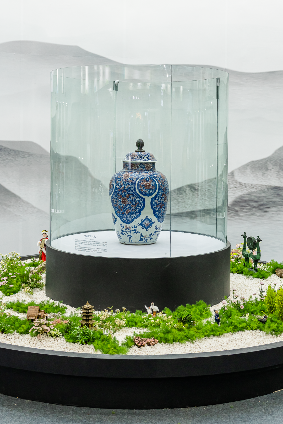 其中,英国回流的藏品清代“龙骑兵瓶”「青花釉里红牡丹披肩纹瓶」更是搭配了花艺名家苏艳玲老师的汉楚传统插花艺术造景。