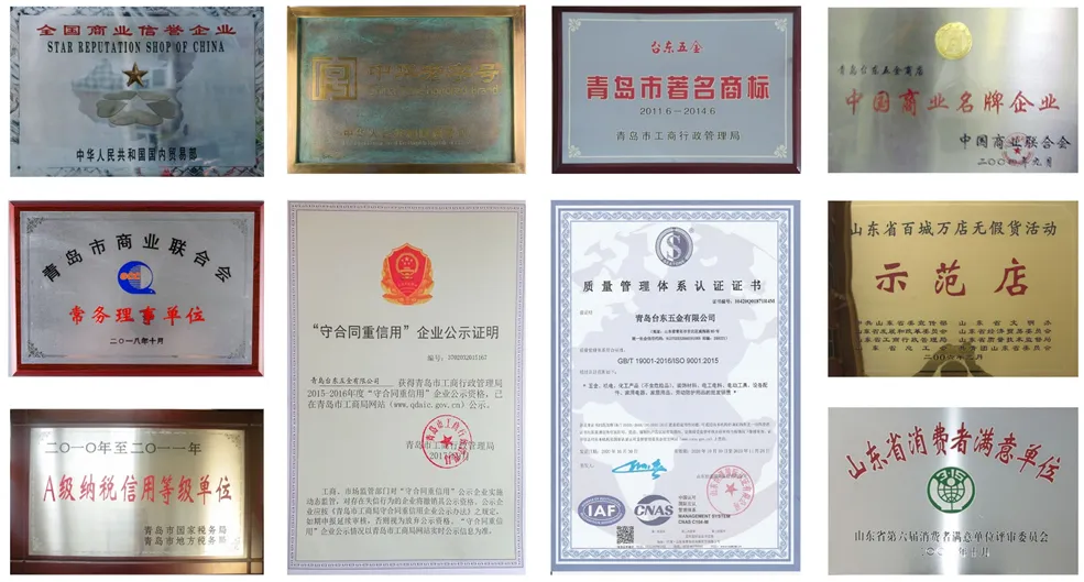 长期以来,企业精心打造“台东五金”著名品牌战略,先后荣获全国商业信誉企业、全国商业名牌企业、山东省文明单位等全国、省、市、局级称号近百项。公司始终贯彻“做生意,先做人”的企业宗旨和“做专、做精、做强”的经营理念,以诚信维护专业品牌,以文化提升企业形象,不断提高“老字号”的品牌影响力。