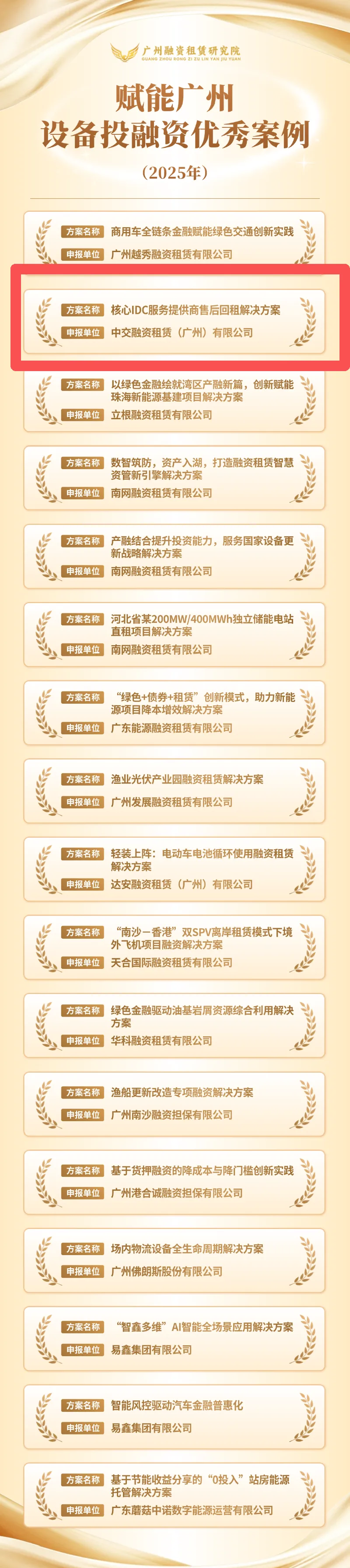 近日,公司申报的“核心IDC服务提供商设备融资解决方案”成功入选《赋能广州·设备投融资优秀案例(2025年)》。此次入选是对公司金融服务能力与产融实践的高度肯定。
