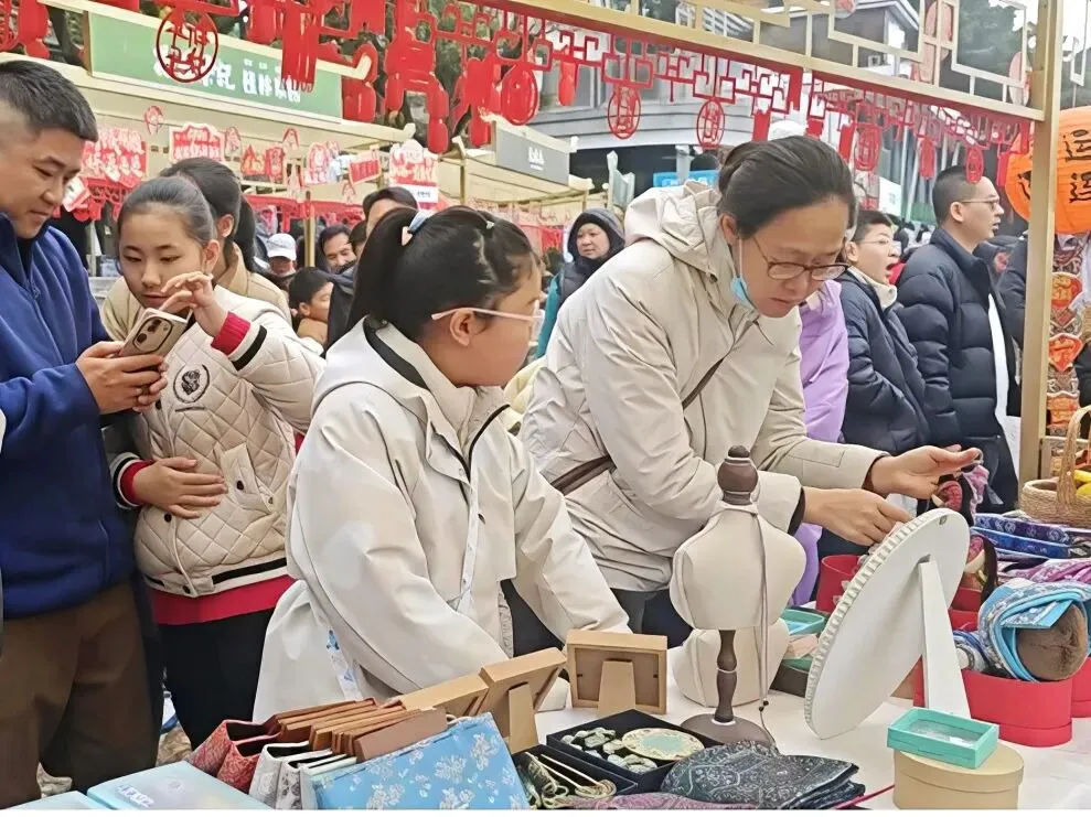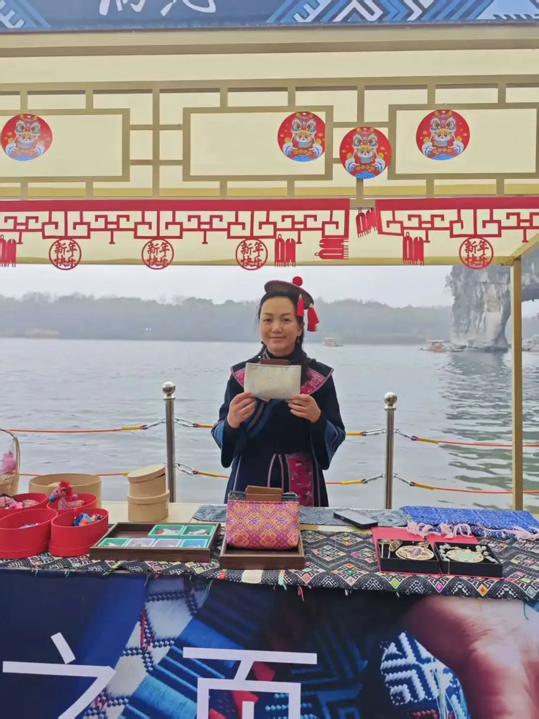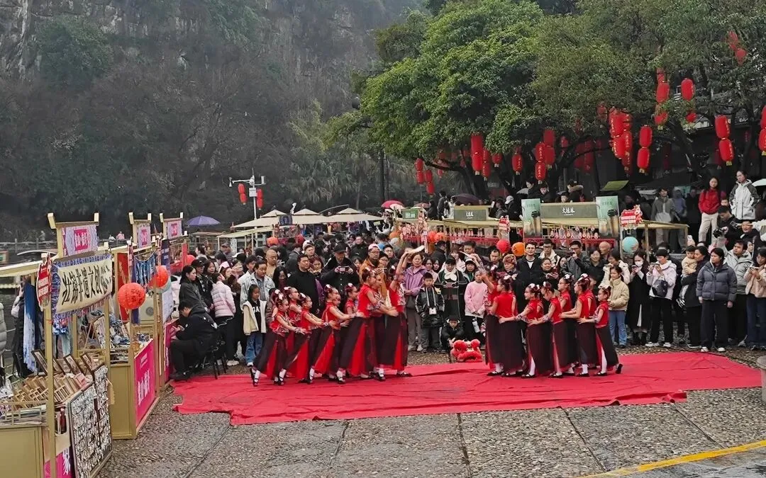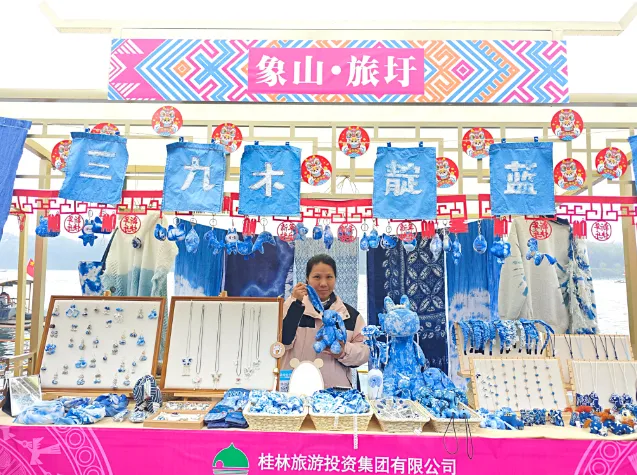 集市上,地道的桂林米粉、平乐十八酿等特色小吃香气四溢,壮锦、扎染等非遗文创产品各具特色,市民游客在山水间感受浓浓的新春氛围。